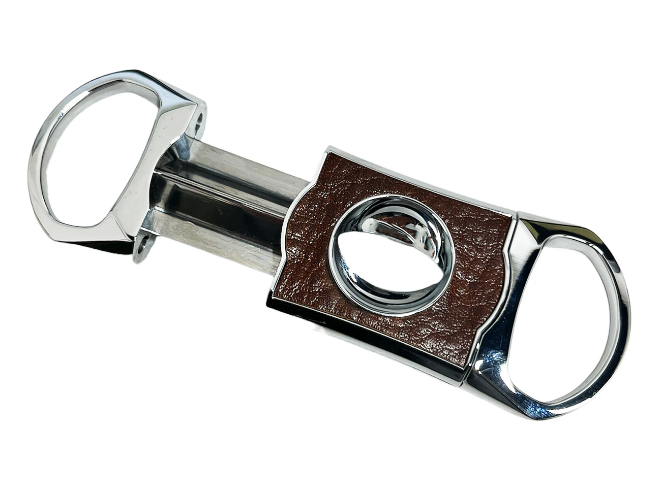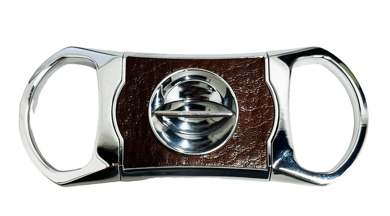 Stainless steel V cutter with antique saddle finish, comes with a matching antique saddle button snap pouch