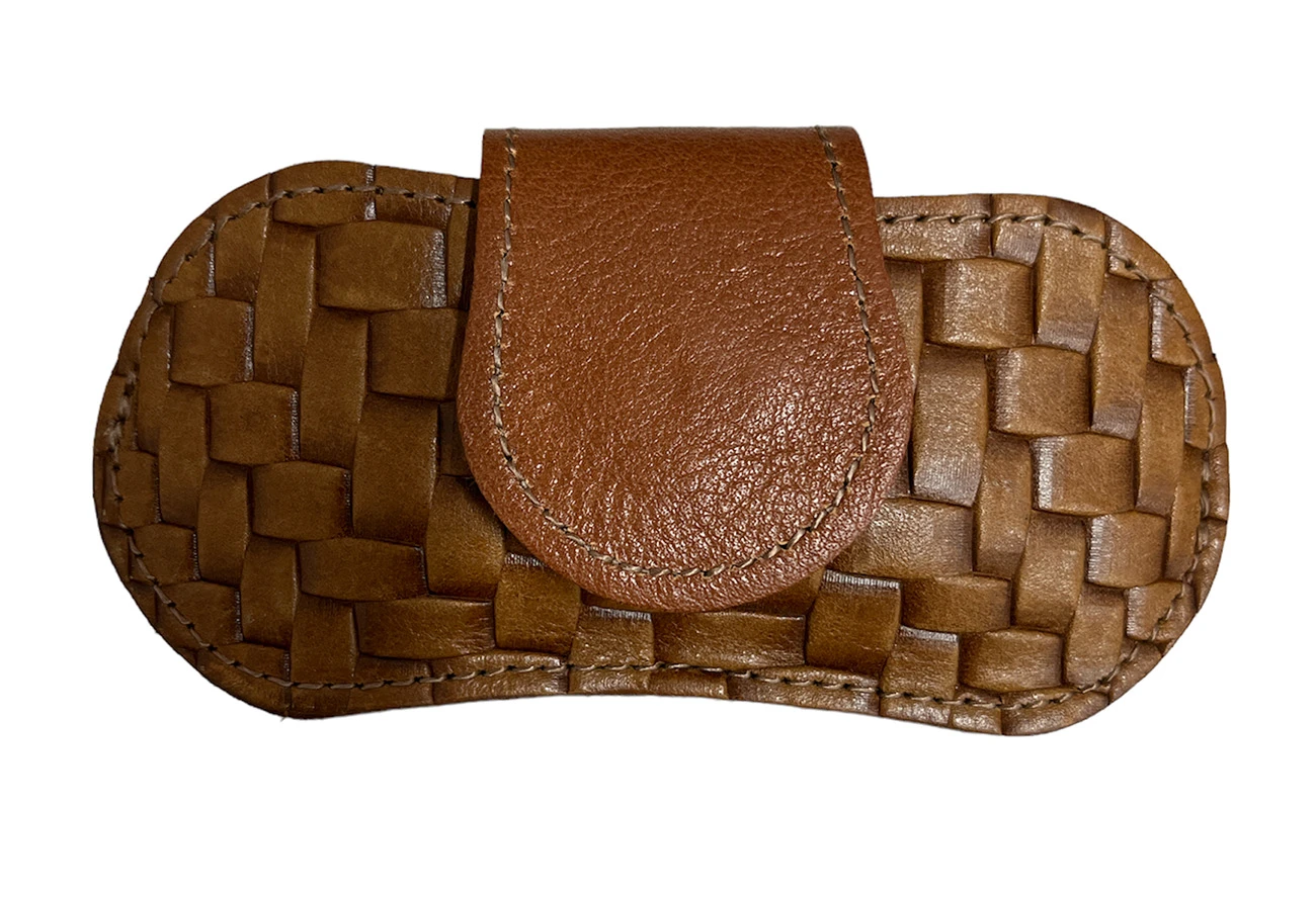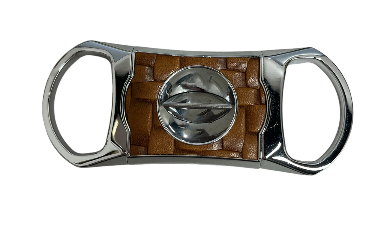 Stainless steel V cutter with Bali leather finish, comes with a matching Bali button snap pouch