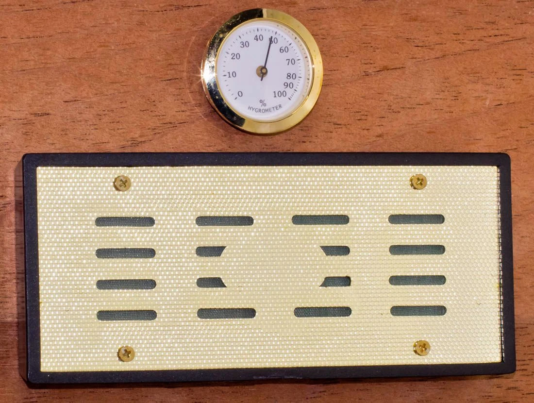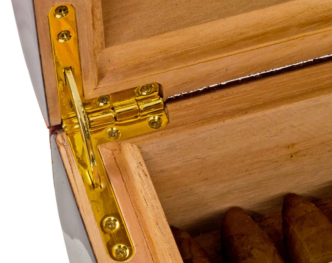 Holds up to 30 Cigars Comfortably Height: 4.3 in; Length: 11.5 in; Width: 7.9 in; Weight: 4 lb 8.6 oz; Ship Weight: 4 lb 15.8 oz Authentic Brown Leather and Rich Cedar Wood with Brass Hinges Completely Airtight with Humidifier and Hygrometer Included for Improved Storage Conditions Crocodile Patterned Leather with Treasure Chest Design