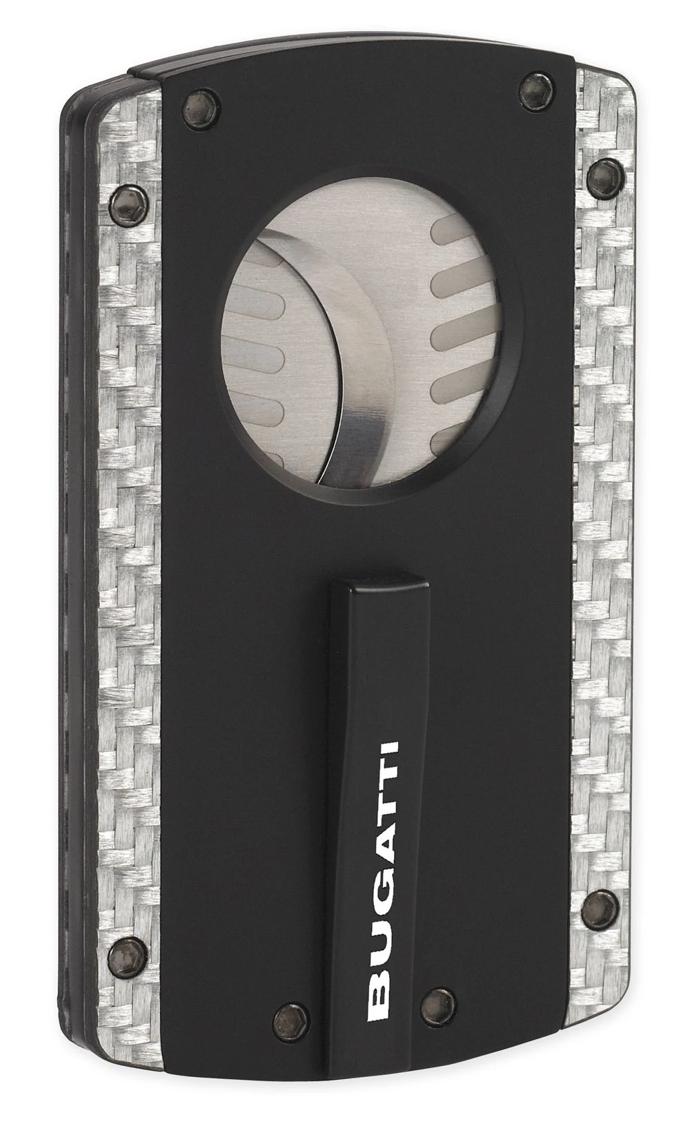 Take this Bugatti cigar cutter for a ride and discover a sharp clean cut! Your cigars don’t stand a chance against the dual stainless steel blades once you release the spring loaded mechanism. This cutter is stylish with reflective carbon fiber accents for lightweight style and durability unlike any other. Order today and being carrying your new favorite cutter today! Cuts up to 56 Ring Gauge Cigars; Guillotine Style Twin, Stainless Steel Blades; Spring Loaded Approx. Dimensions: (L) 3.0 in x (W) 1.75 in x (H) 0.25 in Silver Carbon Fiber Accents with Black Matte; Extremely Durable & Lightweight Packaged in Black Bugatti Giftbox & Bugatti Brand Cardboard Box