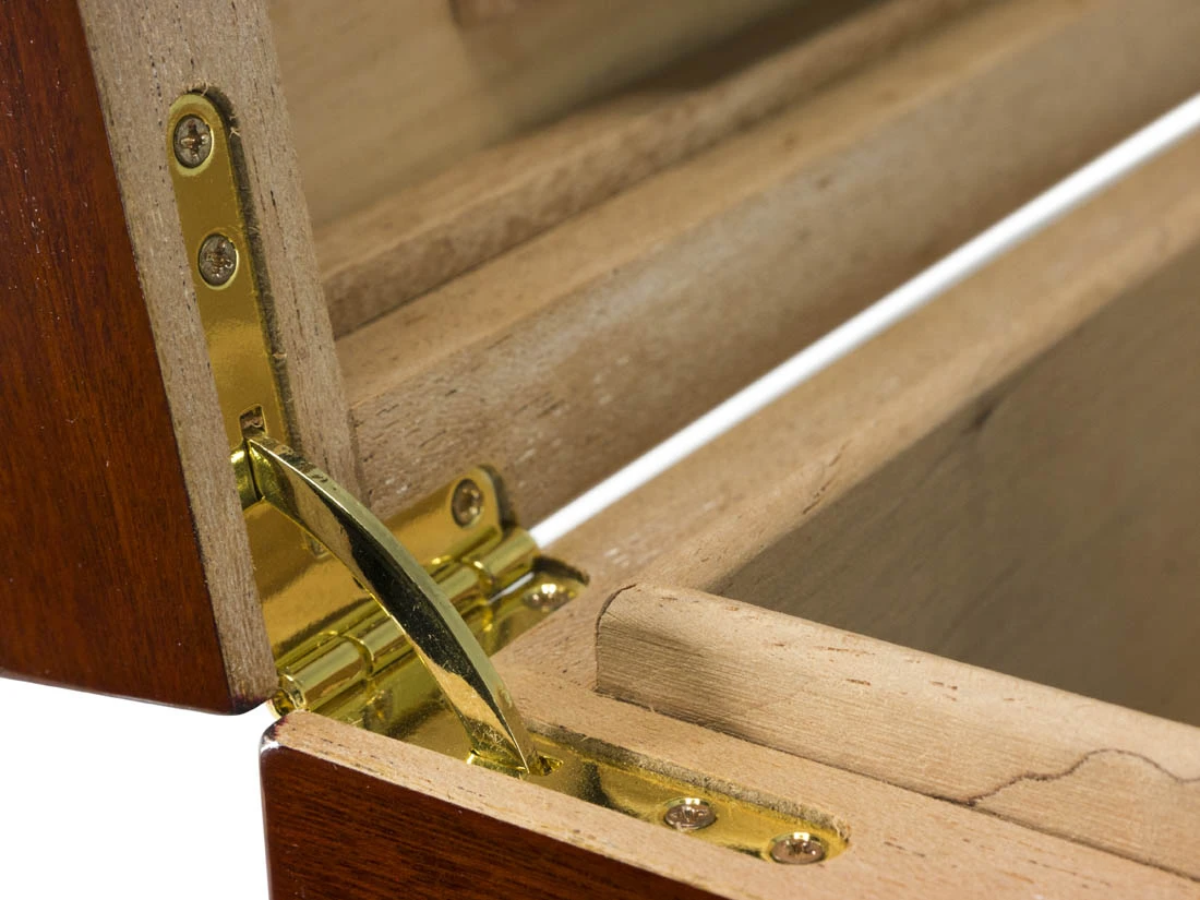 Dimensions: Height: 4.02 in; Length: 13.3 in; Width: 9.2 in; Weight: 5 lb 7 oz; Ship Weight: 5 lb 5.7 oz Holds Between 50 and 75 Cigars Comfortably Stained Cherry Wood Exterior and Rich Cedar Interior Completely Airtight with Humidifier and Hygrometer Included for Improved Storage Conditions Beautifully Finished Cherry Wood with Treasure Chest Design (Key Included)