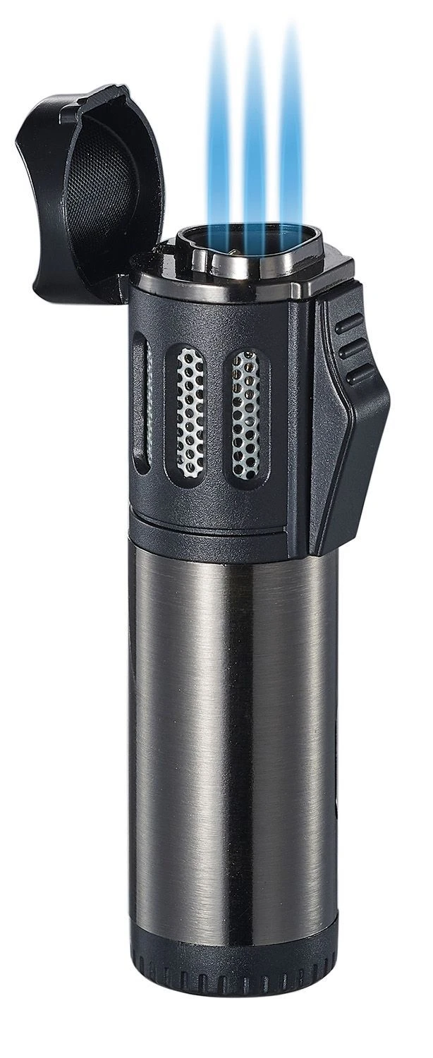 The Visol Artemis Triple Flame Torch Lighter comes in a unique cylindrical design. With a Gunmetal body accompanied with black plastic accents, this lighter creates a sophisticated feel. The light metal and plastic body comes with an easy to use flame adjuster located at the bottom of the lighter. This Triple Jet Wind-Resistant Flame is brought to life with an ergonomic ignition switch. With a fuel level viewing window on the side, this lighter keeps you alert on when to refill with butane so you’ll never unexpectedly run empty. Please note that this product ships with no butane due to shipping regulations. Gunmetal Metal Body and Black Plastic Finish; Light Metal Body Triple Jet Wind-Resistant Flame; Dual Action Ignition (Flip the Top and Press the Ignition); Approx. Dimensions – Length: 3.31 inches, Width: 0.875 inches, Thickness: 0.875 inches; Approx. Weight: 0.125 pounds Butane Refillable Lighter with Adjustable Flame Height; Lighter Does NOT Come Filled with Butane Comes Packaged in a Cardboard Box that is Easy to Gift Wrap