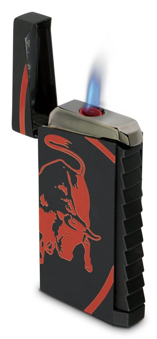 Black Rubberized Finish; Black Matte Cigar Lighter; Red Bull Logo; Single Jet Wind-Resistant Angled Flame; Dual Action Ignition (Flip Top Open and Push Full Side Ignition); Side Fuel Viewing Level (Turns Red when Filled); Butane Refillable; 2.63 Inches (Length) x 1.45 Inches (Width) x .47 Inches (Depth); 3 oz (Weight); Includes Manufacturer’s Limited 2-Year Warranty, Authenticity Card, and Lighter Instructions; Comes in Black and Red Accented Rubberized Box with Velvet Lined Interior, Bull Logo Embossed on Top; Ships Empty of Butane;