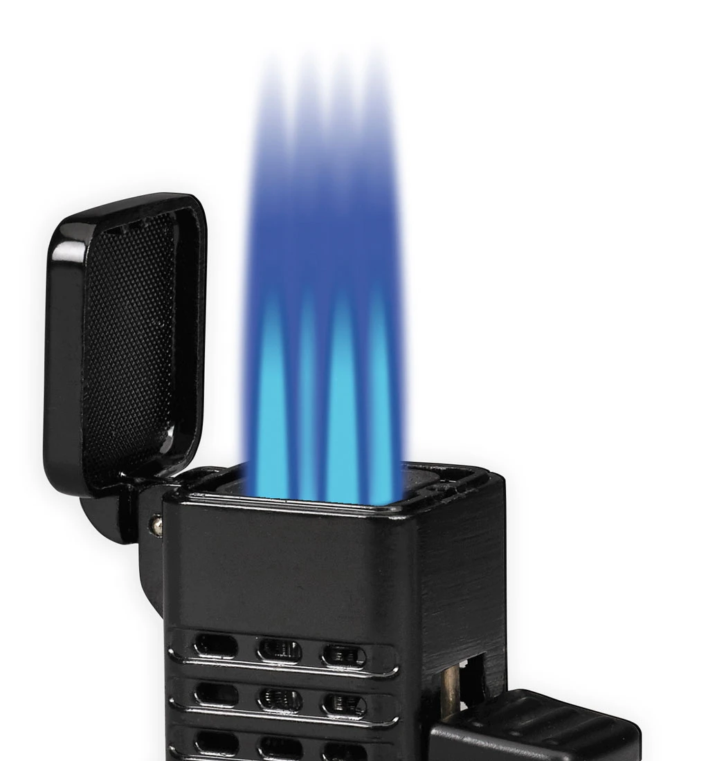 The Vertigo Conquistador Quad Torch Gold Lighter is a single action ignition with a high-powered quad wind-resistant jet flame. The built-in cigar punch and large fuel tank make this a perfect accessory for cigar smokers. A large fuel tank window ensures you never unexpectedly run out and the flame adjuster allows you to pick a flame height that works best for you. Please note that this lighter ships with no butane due to shipping regulations. Solid Gold Metal Body with Black Accents Quad Wind Resistant Torch Lighter, Single Action Ignition; Built-in 7mm Cigar Punch Dimensions: 3.1 inches x 1.25 Inches x 0.8 Inches, Weight: 3.2 Ounces Large Fuel Tank; Large Flame Adjuster; Extra Large Viewing Window Lifetime Warranty When Registering Product Online