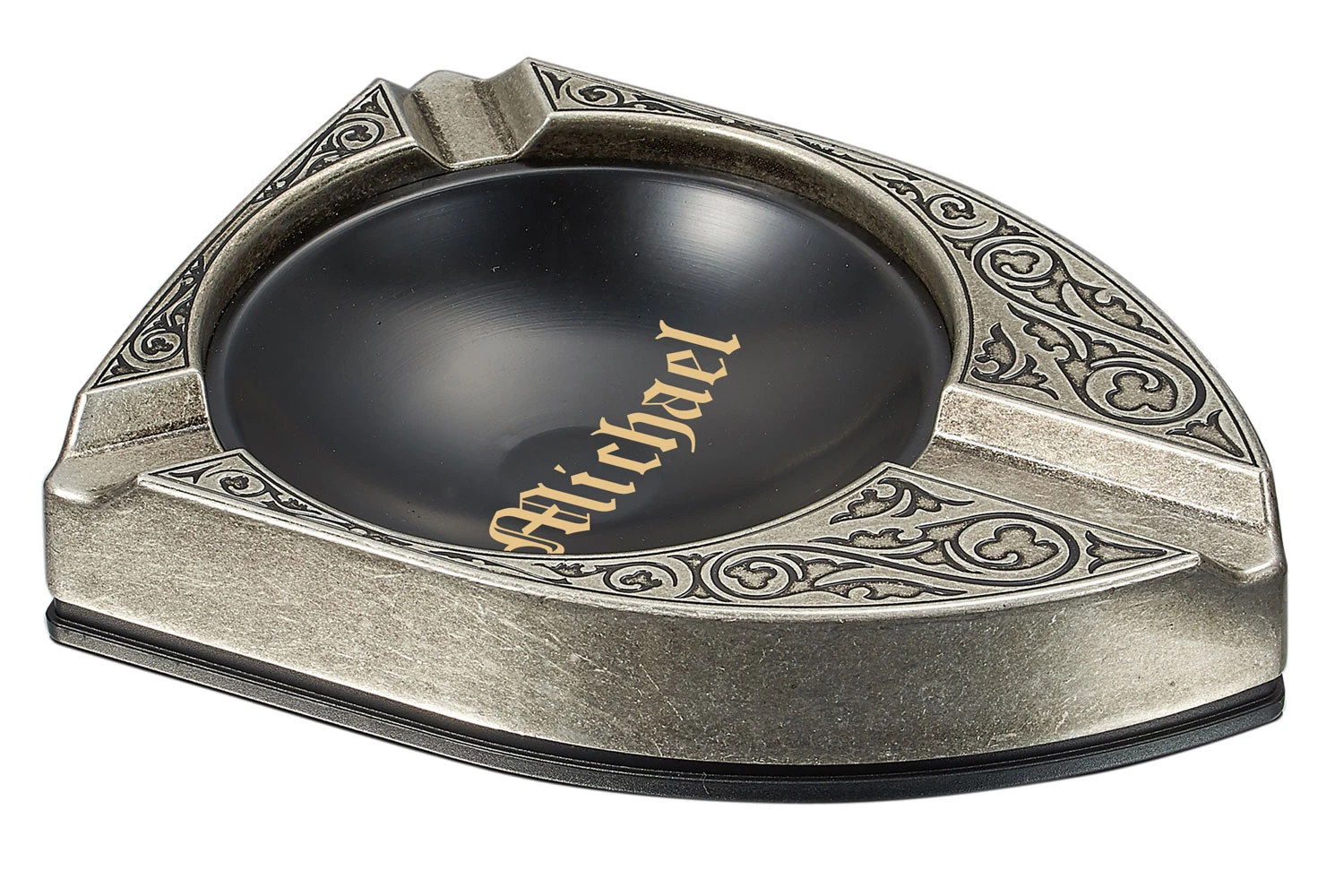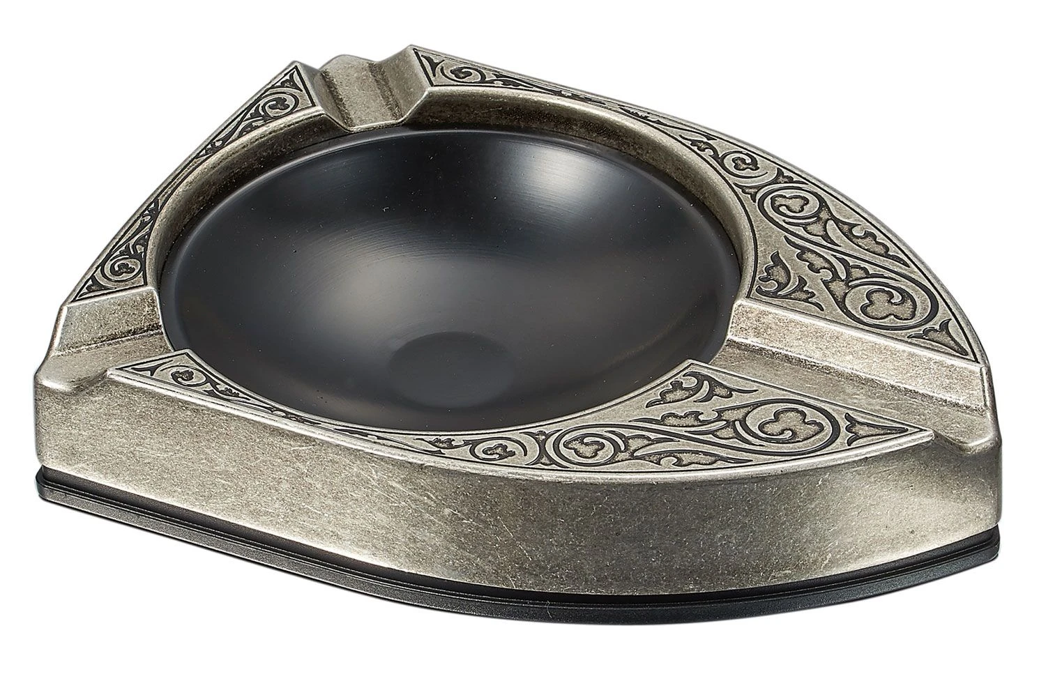 This large metal ashtray features celtic vine designs and an extra large basin for those nights with your pals, and the basin can keep up with even the most efficent cigar connosurs. Featuring three cigar rests, you should always have a place to set your favorite cigar between puffs and the Albion even comes in a stylish display box so you can show it off even when not on the table. Brushed Metallic Silver with Black Finish; Celtic Vine Relief Designs Solid Metal Construction; Wide Deep Basin with Matte Black Finish 6.7 x 4.6 x 1.4 inches; 4 inch diameter basin; 1.3 pounds Three Cigar Rests on Each Corner of the Ashtray An excellent desktop or smoke room addition for your own personal use or small gatherings, the three cigar rests allow you to perform other activates while enjoying your favorite cigar; Comes in Stylish Display Box