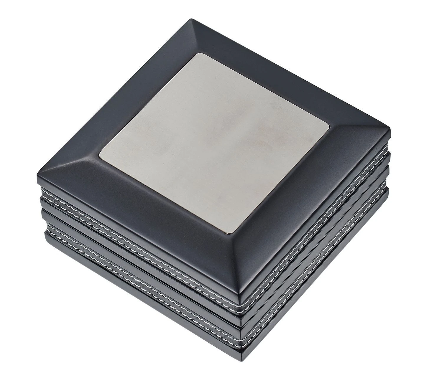 Keep a neat desk and enjoy your cigars with the Carnis folding ashtray set from Visol. Designed for display, the black wooden box features white stitching and curved edges around an engraving plate large enough to hold the most detailed message. Open the box to find a removable stainless steel reservoir on one side, and a rest, punch and cutter on the other. The rest will cradle your cigar while your hands are busy elsewhere. A guillotine cutter fits into a support that will keep your hands free and drop your remnants into the reservoir. If you prefer to draw through a small hole, you’re covered with the included 7 mm punch. Take advantage of a FREE line of engraving when you personalize this executive gift. From form to function, the Carnis meets all of your cigar smoking needs. Approx. Dimensions Open: 9.5″ (length) x 4.75″ (width) x 1.77″ (height) Approx. Dimensions Closed: 4.75″ (length) x 4.75″ (width) x 2.83 (height) Approx. Weight: 1 lb., 10.2 oz. Matte Black Finish Manufacturer’s One Year Warranty Arrives in a white cardboard box Closes for easy storage Holds one cigar comfortably Includes Stainless Steel 52 Ring Gauge Guillotine Cigar Cutter Includes Stainless Steel 7 mm Cigar Punch Removable Stainless Steel Ash Basin Cutter Stand Engravable Top Free Engraving First Line
