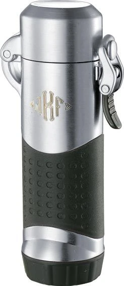 A semi cylinder shaped body ready to assist you on your adventure and quest into the wild, the Summit is the perfect lighter for any outdoor trip. This lighter features a silver tone satin finish body with black rubberized details. Add your personal touch to the lighter with our engraving options. Due to limited space, it’s ideal to get your initials engraved to make this lighter truly your own. Besides its engravable features, this wind and storm resistant jet torch flame lighter is waterproof with the caps closed. Open up the top of lighter and press down on the button to easily light up the flame. On the opposite side, discover the fuel gauge window perfect for identify the level of butane left with its percentage marks. Great for outdoor trips and customizable, get the Summit help you light your way! Approx. Dimensions: 3.25″ (Height) x 1.00″ (Width) x 0.75″ (Thickness) Approx. Weight: 2.46 oz. Wind Resistant Jet Torch Flame Lighter Ideal Lighter for Outdoors Fuel Level with Gauge Waterproof with Cap Closed Silver Satin with Black Rubberized Details and Engravable Comes in Gift Box and Cloth Pouch 1 Year Warranty Shipping Note: This lighter does not come filled with Butane. Butane Refillable Torch Flame Lighter Engraved example in inset image shows JKF initials (for John F. Kennedy) in Diamond Monogram font. Initials were entered as JKF as well.