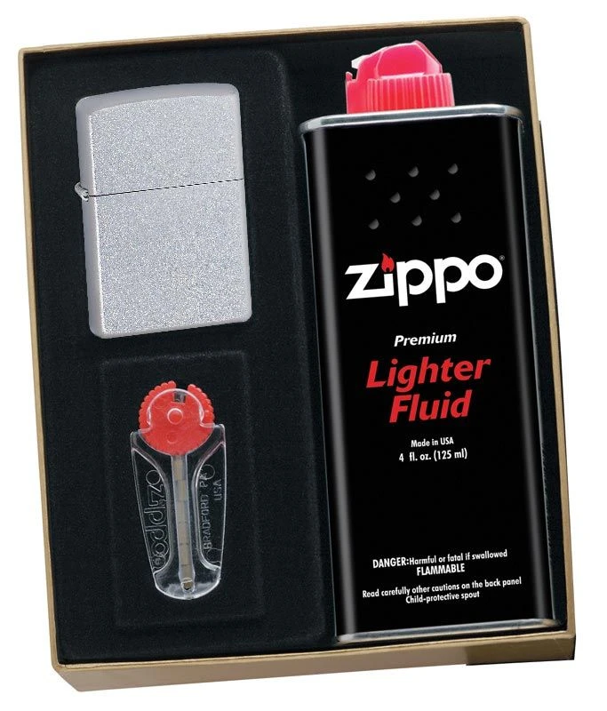 With an attractive satin finish that can be engraved when you order, the Zippo lighter in this gift kit will be a great addition to your accessories. Its sturdy metal body features a reliable flint ignition system that produces a windproof flame for you. A lifetime warranty ensures this lighter can be counted on whenever you need a flame. Included with a four ounce can of lighter fluid and a flint dispenser for your convenience. Order from eLighters and you can even personalize your lighter with up to one line of free engraving!
